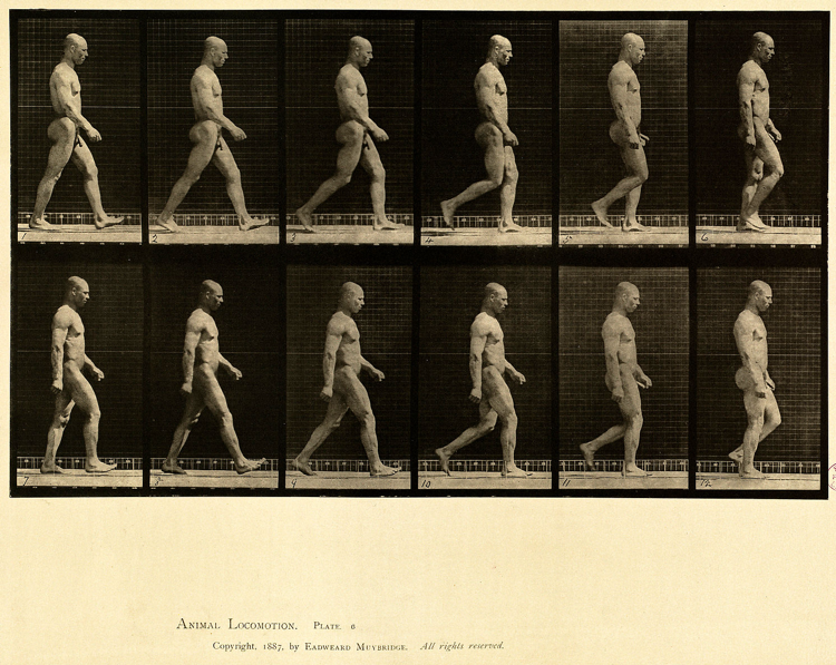Muybridge was gefascineerd door alles wat (en hoe het) bewoog. In zijn fotoreeksen Animal Locomotion (1887) en The Human Figure in Motion (1901) laat hij in fotoreeksen zien van bewegingen van dieren en mensen, in allerlei poses en handelingen. Zo ook de menselijke loopbeweging.