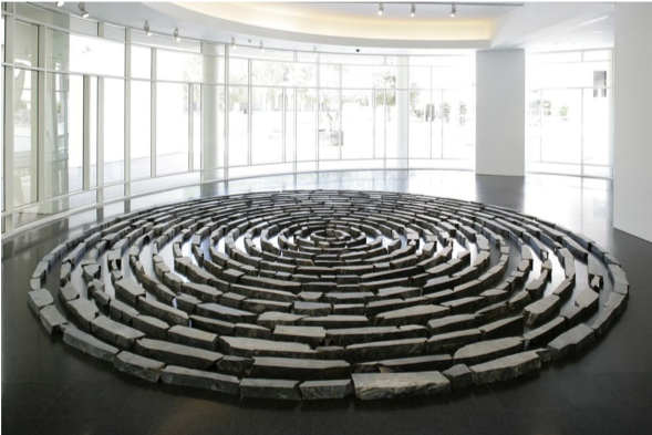 Toch exposeert Long ook in musea. Niet alleen toont hij zijn foto’s en tekstwerken, maar maakt hij ook (op de ruimte afgestemde) wandschilderingen van modder en vloersculpturen waarbij hij ‘de natuur in het museum drapeert’. Voor deze vloersculpturen ligt de grondvorm (cirkel, lijn, doolhof, etc.) vast, maar varieert hij met de uitvoering. (Sta ook eens even stil bij de gedachte hoe hij deze materialen überhaupt van de vindplek het museum heeft binnen gekregen…🤔🤯!)